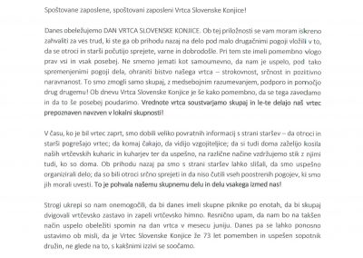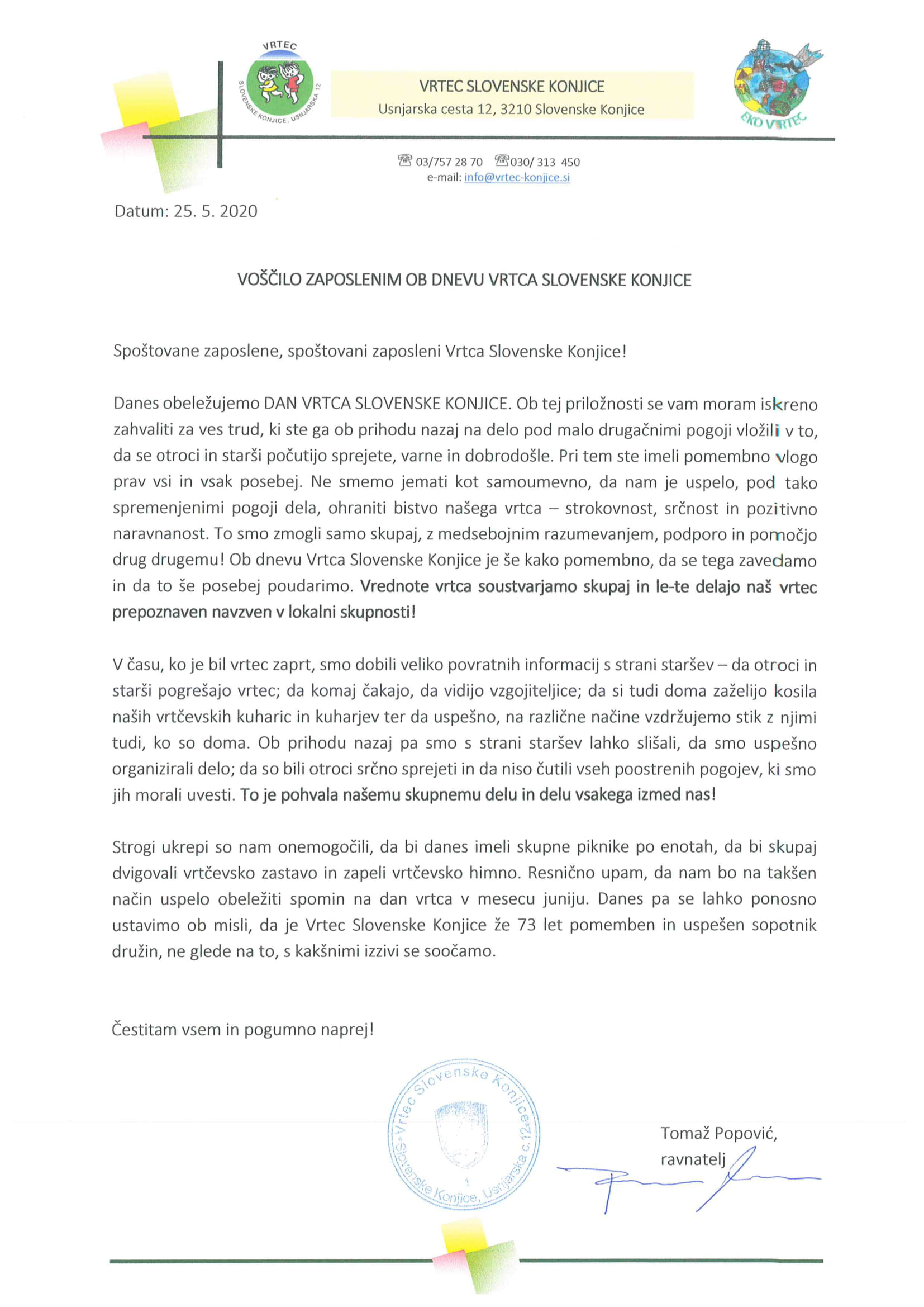 VOŠČILO ZAPOSLENIM OB DNEVU VRTCA SLOVENSKE KONJICE Avtor: Strokovni delavci vrtca | Maj 25, 2020 Danes obeležujemo Dan Vrtca Slovenske Konjice, ob tej priložnosti ravnatelj vrtca vsem zaposlenim izreka čestitko.